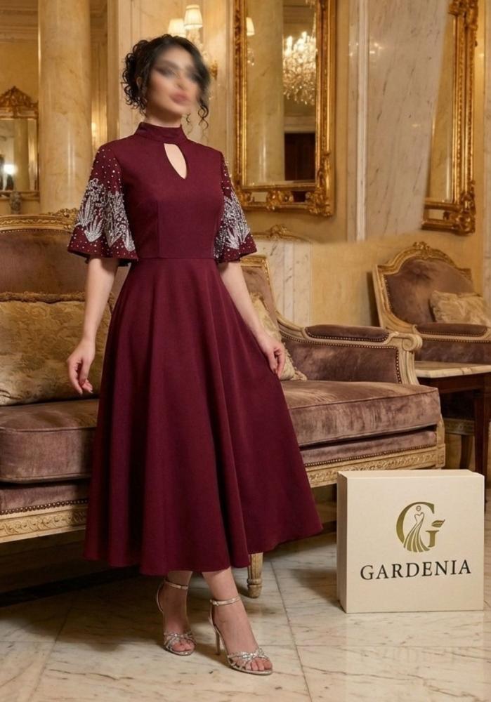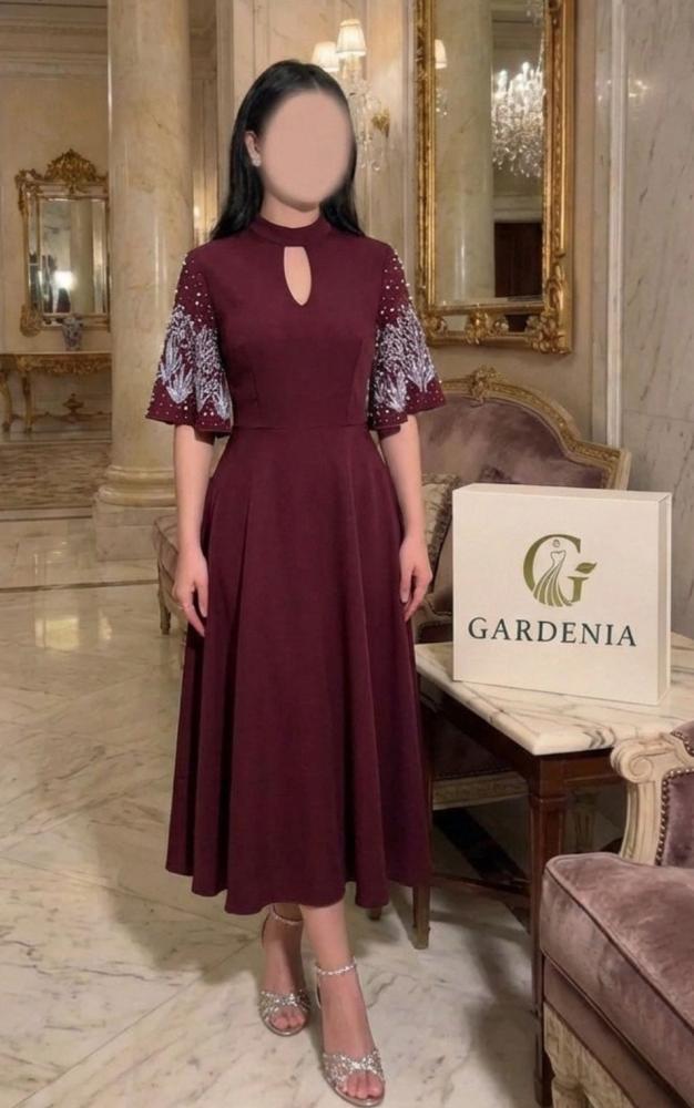 هذا الفستان البرغندي الأنيق هو تجسيد حقيقي للفخامة العصرية والبساطة الراقية في آن واحد، مما يجعله قطعة فريدة لمناسباتكِ الخاصة. يتميز بتصميم "ميدي" (متوسط الطول) مع تنورة واسعة منسدلة بأسلوب A-line الفضفاض تمنحكِ حركة رشيقة مريحة وإطلالة متوازنة. يبرز جمال الفستان بياقة مرتفعة أنثوية مع فتحة صدر جذابة على شكل قطرة ماء، بينما تضفي الأكمام القصيرة المزدانة بتطريزات يدوية بيضاء وخرز لؤلؤي دقيق لمسة من البريق الفاخر. من الخلف، يكتمل التصميم بسحاب مخفي طويل يضمن انضباطاً مثالياً وانسيابية رائعة على قوام الجسم. إنه الخيار الأمثل للمناسبات المسائية الفخمة التي تتطلب حضوراً ملكياً هادئاً يجمع بين الحشمة الكلاسيكية والجمال العصري الأخاذ.