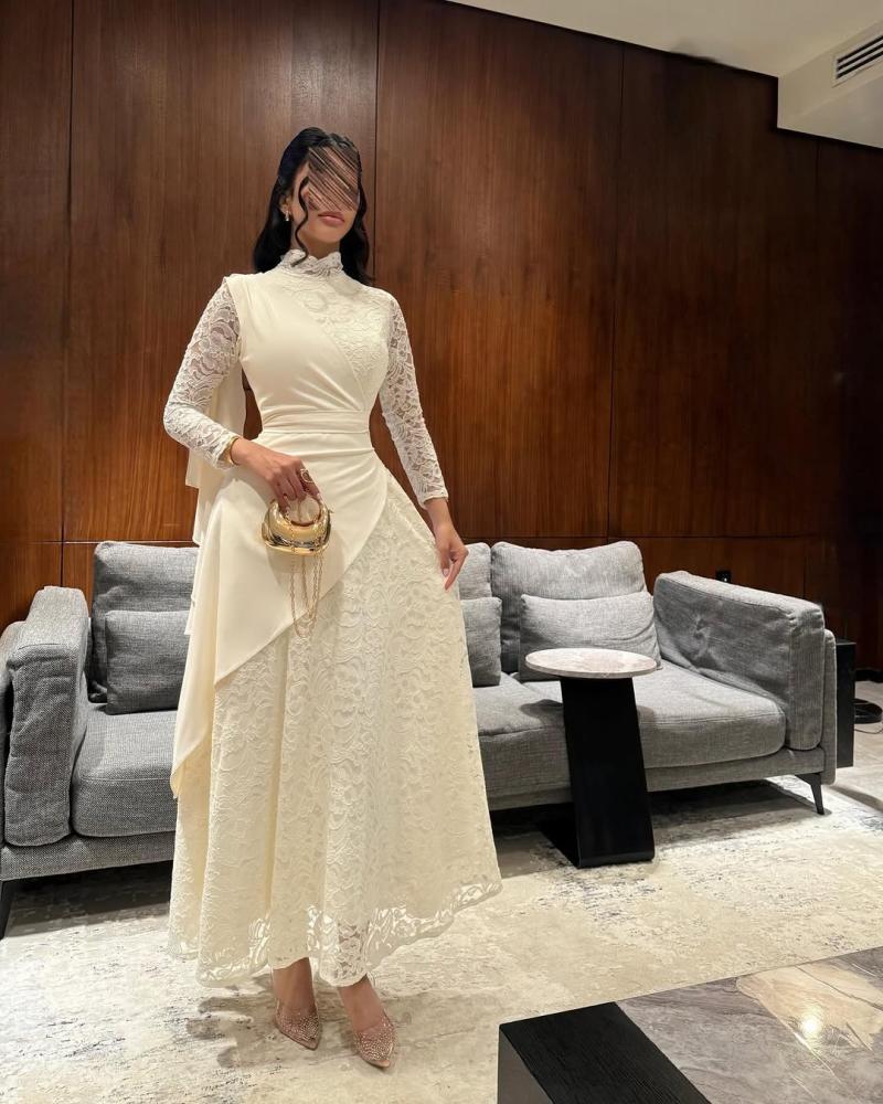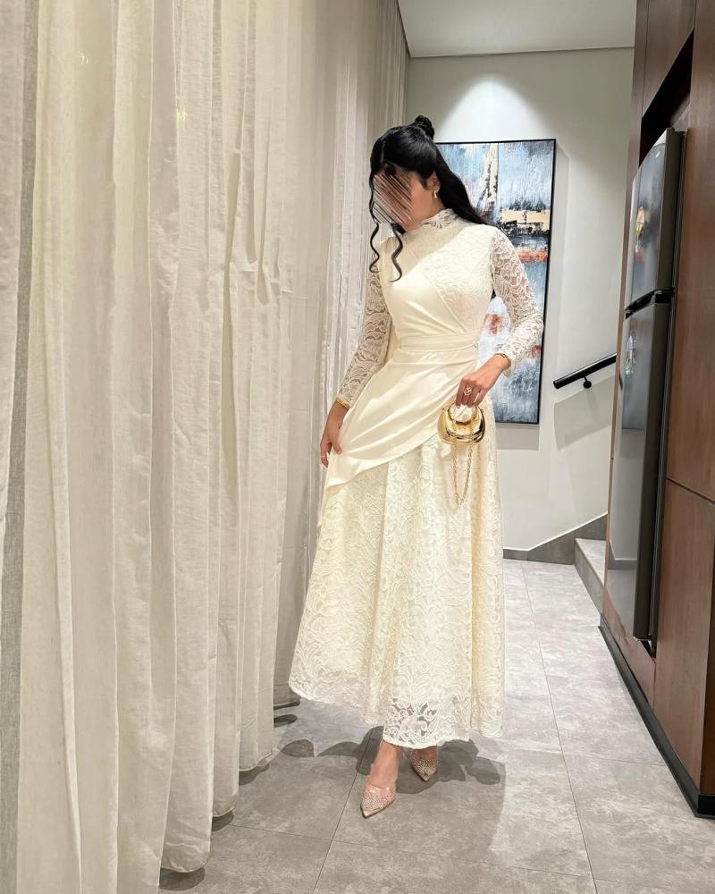 تألقي كالأميرات مع هذا التصميم الاستثنائي من مزون فاشن. يجمع الفستان بين رقة قماش الدانتيل المشغول بدقة على كامل التنورة والأكمام، وبين فخامة القماش الناعم في الجزء العلوي الذي يأتي بقصة "درابيه" هندسية تبرز جمال الخصر. يتميز بياقة عالية من الدانتيل تمنحك مظهراً ملكياً محتشماً، مع ذيل جانبي منسدل يضفي حركة انسيابية ساحرة عند المشي.