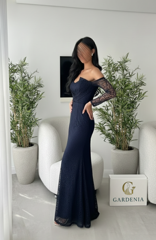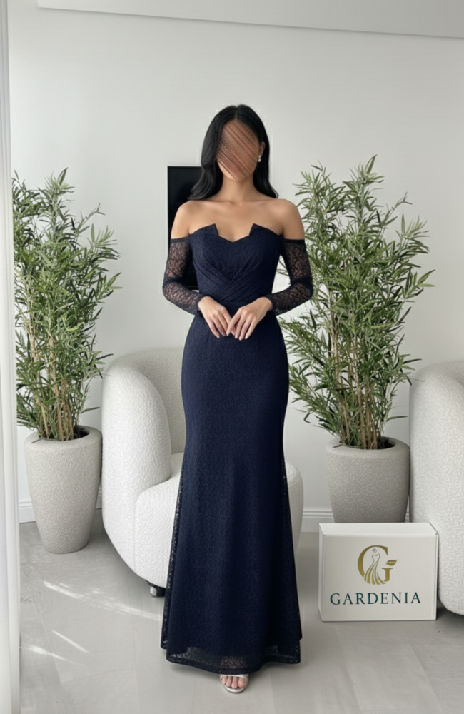 يجمع هذا الفستان الكحلي الطويل بين الفخامة الكلاسيكية واللمسات العصرية الجريئة، مما يجعله خياراً مثالياً للمناسبات السيمبلي الفاخرة. يتميز التصميم بقصة "حورية البحر" (Mermaid) التي تنساب بنعومة لتبرز جمال القوام، مع اعتماد قماش الدانتيل المخرّم المشغول بدقة على كامل الفستان ليمنحه عمقاً وفخامة بصرية.
