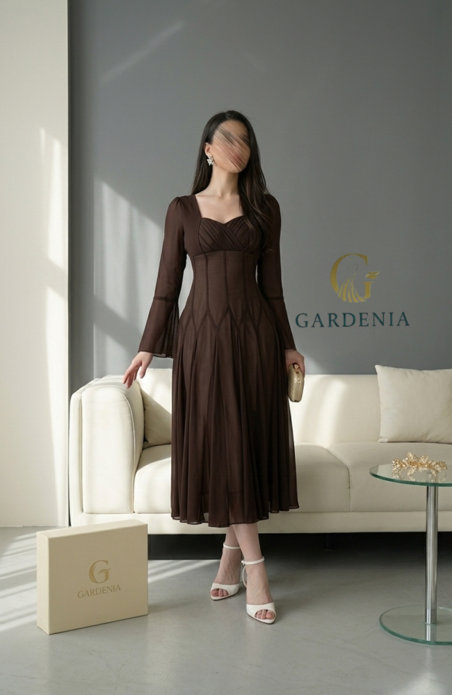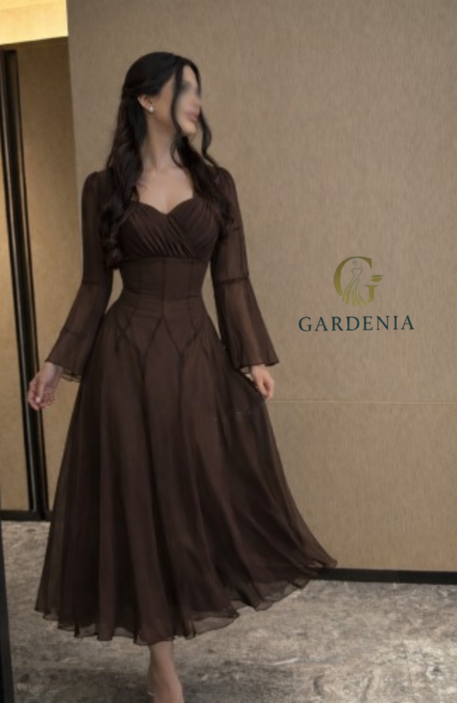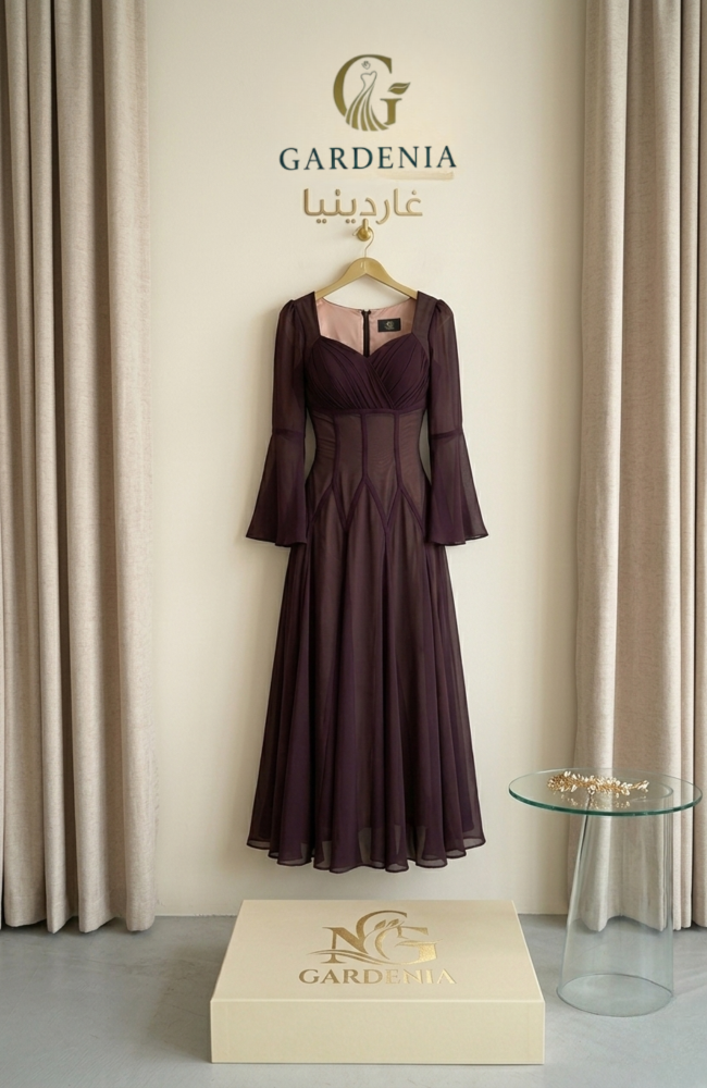• الأكمام: يتميز بأكمام طويلة تنتهي بتصميم "الجرس" الواسع، مما يضيف لمسة أنثوية ساحرة.